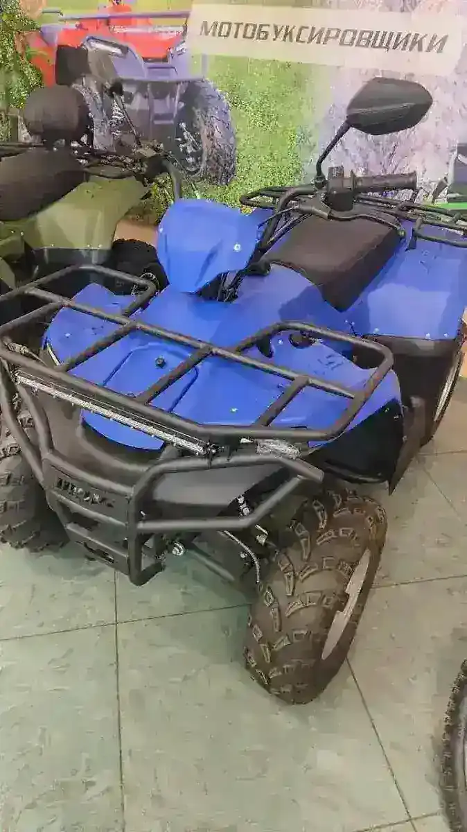 Квадроцикл бензиновый IRBIS ATV 250. Оборудован мощным двухсот пятидесяти кубовым двигателем, мощностью 18 л.с. Развивает скорость до 65 км/ч. Коробка передач механическая с реверс-редуктором. Система запуска электрический стартер. Комплектуется стандартной панелью приборов, зеркалами, фильтр боксом, поворотниками.